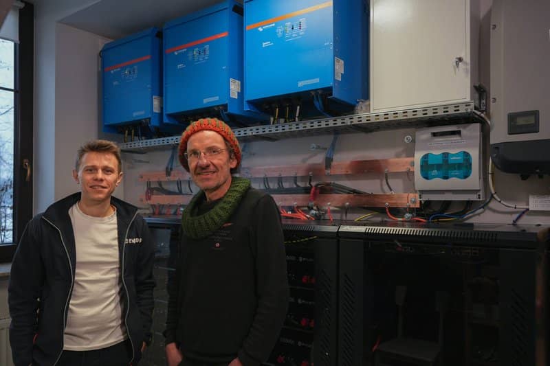 After months of work: evaluating the farm’s grid power consumption, followed by design then build of the containerised battery based power system – the time finally arrived to demonstrate the resilience of the Puiul Dobrogean poultry farm’s 180kVA private power plant …by disconnecting the electricity grid whilst the power consumption was running at 141kW! Nothing happened. In a good way. The load was transferred to the battery-based energy installation without so much as a flicker! The Romanian poultry farm consumes 1.5MWh of energy per day in the height of summer and had been relying on two back up generators to overcome grid failures; but when one of the generators failed to start – endangering livestock – it was clear that there was a vulnerability which could not be tolerated. Ionel Dobre – the owner of Puiul Dobrogean farm – started his business in 2012 and has expanded it steadily. For him this realisation of energy insecurity brought with it an opportunity – to make a financial investment to drastically reduce energy costs at the same time as guaranteeing energy security. The new installation is projected to supply between 93% and 95% of the farm’s energy consumption. (L) Ionel Dobre (R) Ovidiu Stan Ovidiu Stan is the General Manager at Stoneage Energy – who are based in Cluj-Napoca, Romania – and wanted to implement a technical solution which could charge this huge battery bank efficiently, and through all seasons – not just the summer. Based on the results Stoneage Energy had experienced with their previous large installations, they decided to increase the battery charging capacity by adding 12 MPPT solar chargers to the 12 Quattro Inverter/Chargers – to provide a additional 1200 amps of charging capacity. Storage: Over 1.3 MWh in 48V LiFePO4 batteries (Low Voltage). Low voltage was chosen for safety and because it allowed the use of the most robust inverters available. Inverters: 12 x Quattro Inverter/Charger 15000VA – capable of delivering 180 kVA and managing load peaks – 15000 models can actually handle 25000W peaks. AC/DC Architecture: A hybrid ecosystem using 300 kW of Fronius Tauro 100 inverters (AC-coupled) for direct daytime consumption and 12 SmartSolar MPPT 250/100 solar charge chargers = 1200 Amps (DC-coupled) to efficiently and directly charge the battery bank. PV panels: Over 600 bifacial panels rated at 645W (510 pcs on the 3 Tauros + 96 pcs on the 12 MPPTs) offer a total of ≈ 400 kWp. Monitoring: Cerbo GX & VRM Portal . Safety via Loop: The hall’s electrical grid was designed in an underground loop. If a cable is accidentally severed (e.g., by an excavator), power is supplied via the other arm of the loop, ensuring 100% continuity. AI Automations with Node-RED : Node-RED Temperature de-rating and shutdown code The system features several innovations developed by Stoneage Energy engineers specifically for large projects like this one, including: A huge pre-charge & emergency shutdown system, controlled by in-house software for controlling and monitoring more than 100 parameters of the whole system. Rapid shutdown & pre-pre-charge: For complete system disconnection in the unlikely event of any fault. Dynamic Power Balancing: For large systems when solar production is low and/or the grid is weak or unstable. Battery protection mode: Maintains a useful power reserve for power outages or a low next day power harvest forecast, consumption, and grid energy costs. Ionel says “Energy is monthly business cost. Once you install a system like this, that cost becomes an investment – this equipment is built to last 15-20 years.”