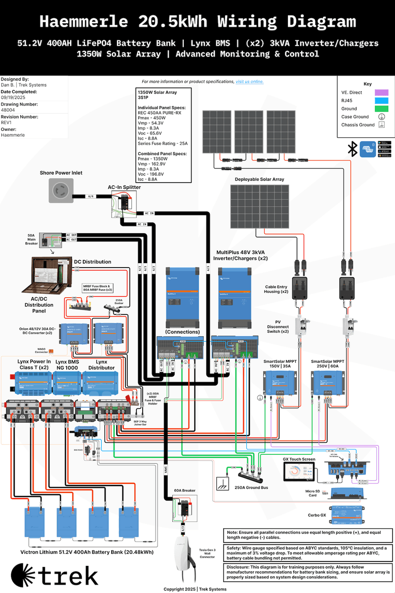 Solar Energy is harvested by two SmartSolar MPPT 150/35 solar charge controllers which store power into four Lithium NG Batteries rated at 51.2V 100Ah – offering 20kWh of stored energy. (The latest NG Next Generation batteries, by the way, feature an integrated shunt, and advanced communication which allows up to 50 batteries to be combined in the same bank. The mandatory battery management system for NG batteries is the Lynx Smart BMS NG.)